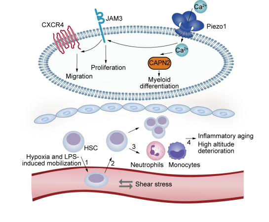 造血干细胞 (HSC)位于骨髓中并处于静息状态,但在低氧、炎症和细胞因子刺激等条件下,被动员至外周血并暴露于血流剪切力环境中。然而机械刺激调控HSC的机制尚不明确。