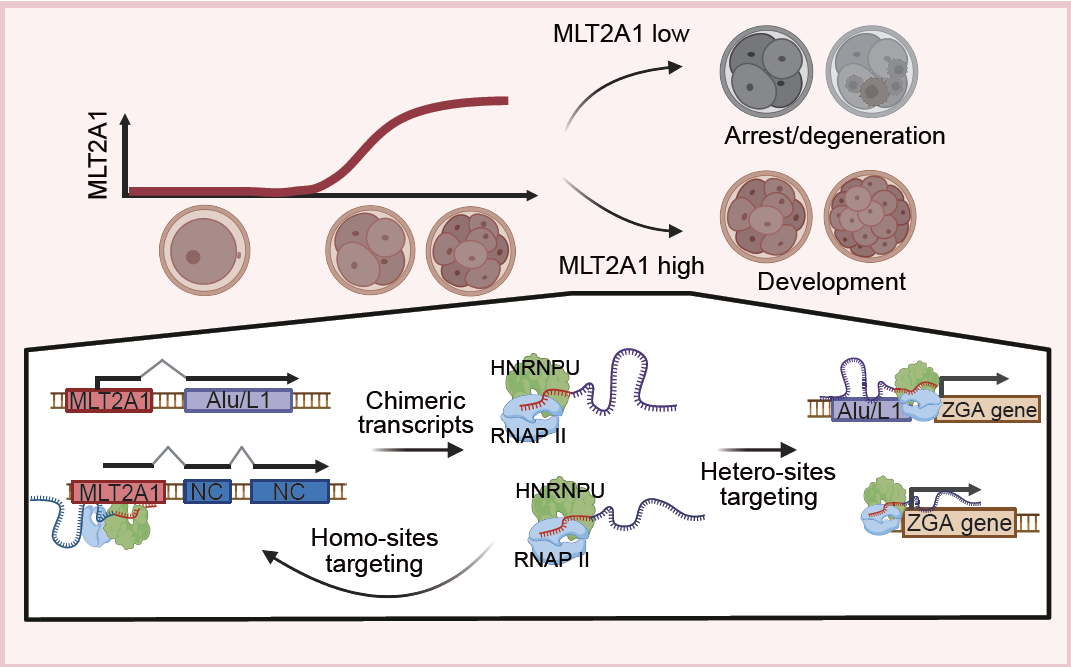 团队发现,MLT2A1嵌合体主要富集在细胞核内,形成明显的核内凝聚点。机制探究揭示,MLT2A1 RNA通过与核内蛋白HNRNPU 相互作用,从而发生凝聚,同时能够招募基因转录的关键执行者——RNA聚合酶II,从而促进合子基因组激活基因的转录表达。“为进一步验证MLT2A1嵌合体与HNRNPU的协同作用,我们分别敲除MLT2A1和HNRNPU,发现合子基因组激活基因的新生RNA合成显著减少,并且胚胎发育出现阻滞。”梁洪青说,在合子基因激活过程中,MLT2A1 RNA就像一个繁忙的“协调者”,一边像钥匙一样配对到关键的DNA结合位点,一边又把RNA聚合酶II吸引到这些DNA附近,帮助其最终激活该时期关键基因的转录。