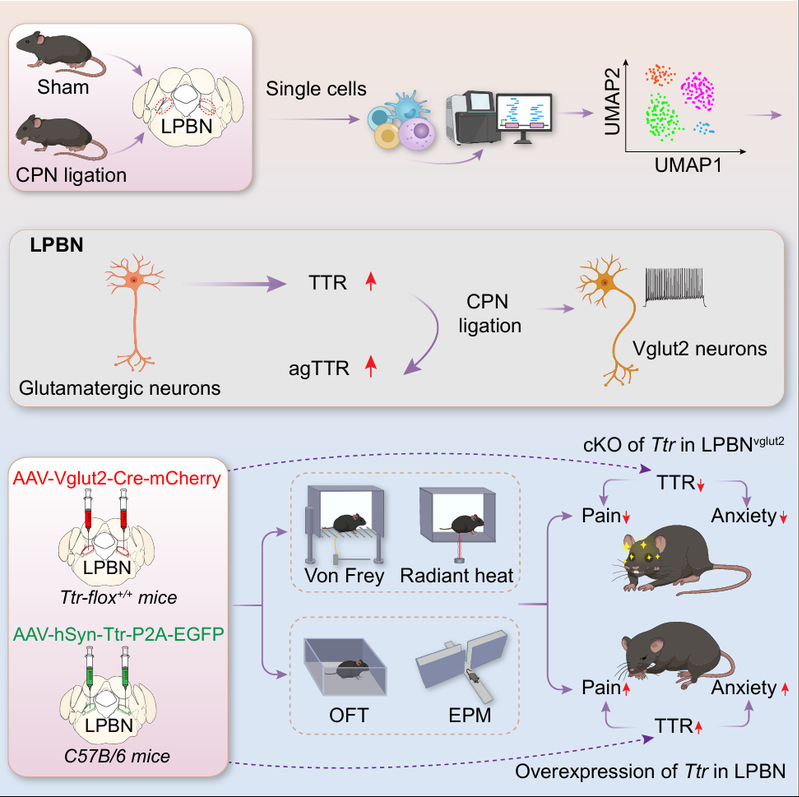 图1. 外侧臂旁核中TTR驱动神经病理性疼痛与焦虑共病的模式图