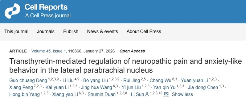 近日,浙江大学脑科学与脑医学学院、脑与脑机融合前沿科学中心、浙江大学医学院附属第二医院和良渚实验室孙丽/段树民团队在《Cell Reports》上在线发表题为“Transthyretin-mediated regulation of neuropathic pain and anxiety-like behavior in the lateral parabrachial nucleus”的研究论文,揭示了外侧臂旁核中转甲状腺素蛋白通过RAGE/NF-κB信号轴调控神经病理性疼痛与焦虑共病的关键分子机制。