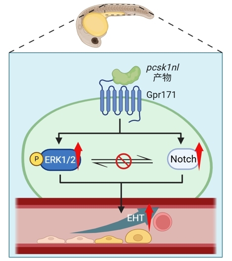 2026年1月24日,浙江大学动物科学学院李艳研究员和医学院徐鹏飞研究员团队合作在国际著名学术期刊《美国科学院院刊》(PNAS)上在线发表题为“Gpr171 regulates embryonic hematopoietic stem cell emergence via ERK1/2 and Notch signaling”的研究论文。该研究发现G 蛋白偶联受体家族中的GPR171是调控脊椎动物胚胎造血干细胞形成的关键因子,该受体与其配体协同作用,通过激活细胞内重要的ERK1/2和 Notch信号通路,共同促进了造血干细胞的诞生。