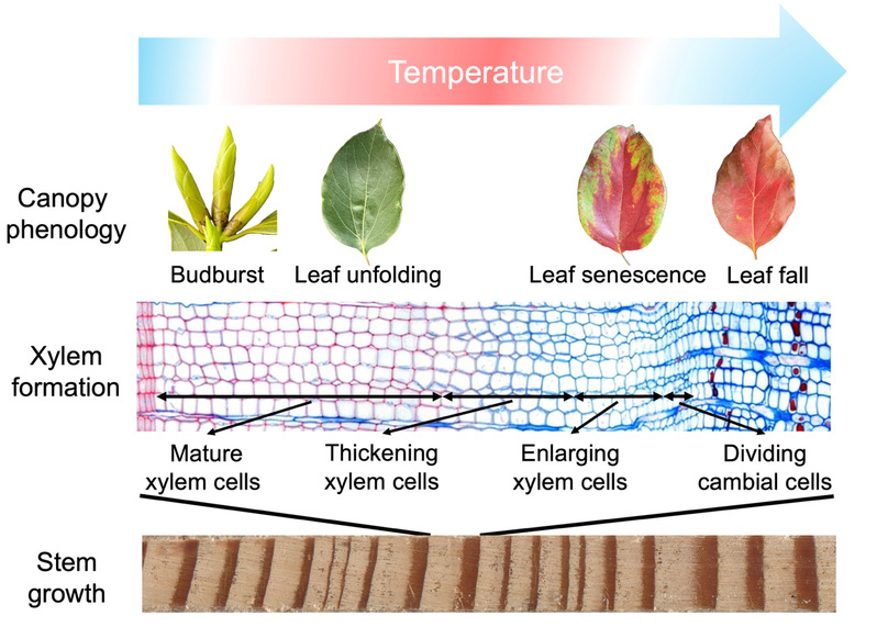 图1. 树木生长季内冠层物候变化与木材形成过程