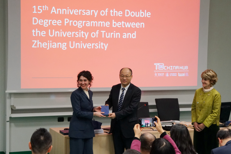 在都灵大学,马琰铭一行会见了克里斯蒂娜·普兰迪(Cristina Prandi)校长。马琰铭介绍了浙江大学的办学情况,并回顾了两校在中国学、商学、国际政治等领域的合作成果,期待持续深化重点领域合作、携手培养卓越人才。普兰迪围绕都灵大学的办学情况和发展动态作了介绍,并表示希望着重加强双向学生交流,为两国友好厚植根基。马琰铭代表学校向都灵大学赠送了《中国历代绘画大系》,并出席了两校中国学双硕士项目15周年交流会。