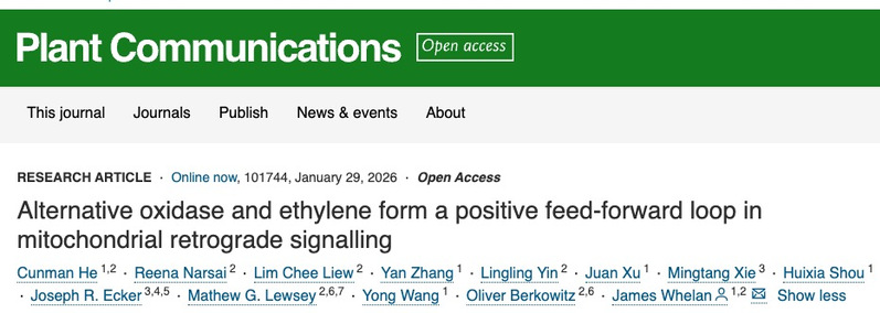 2026年1月29日,浙江大学生命科学学院James Whelan/贺存满团队,联合澳大利亚La Trobe大学、美国Salk研究所等单位,在国际知名植物学期刊《Plant Communications》上发表了题为“Alternative oxidase and ethylene form a positive feed-forward loop in mitochondrial retrograde signalling”的研究论文。