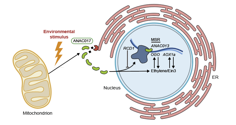 植物在自然生长过程中持续面临干旱、高光、高温等多种非生物胁迫,这些胁迫严重影响作物产量与品质。为适应环境变化,植物进化出复杂的细胞器与细胞核之间的通信机制——即细胞器逆向信号。其中,线粒体作为能量和代谢中枢,在感知内部紊乱与外部胁迫时,可通过逆向信号通路调控核基因表达,以重塑细胞代谢、维持稳态并启动适应性响应。然而,线粒体应激信号如何整合激素合成、氧化还原平衡与能量代谢,从而系统调控植物抗逆性的分子机制,尚不清晰。